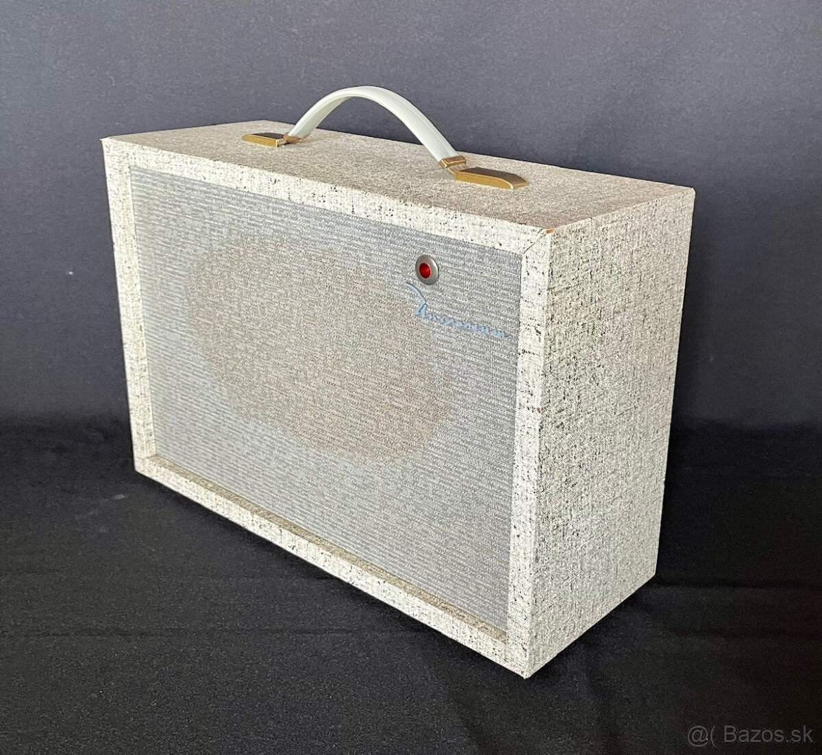 Výrobca: QUELLE Gmbh (UNIVERSUM), Furth und Nurnberg. Made In GERMANY. Výkon: 6W. Vstupy: Gitara / mikrofón, hlasitosť pre každý kanál, spoločná TONE clona. Elektrónky: SIEMENS ELL80, Ecc83 (2x). Reporuktor: DEW Magnetfabrik Dormund. Váha: 4 kg. Aparát v nehranom a totálne originálnom stave od 1. majiteľa bez akýchkoľvek zásahov !!! (Hraný max. 10x za celú dobu, t.j. 60 rokov!) Na gitaru ideálne skreslenie pri prebudení a tzv. izbovej hlasitosti. Pri práci s Volume potenciometrom gitary sa skreslenie krásne čistí. K aparátu redukcia z DIN na 6,3 Jack kábel. Skutočný VINTAGE dynamický zvuk a charakter. Rovnako veľmi vhodný aj na ústnu harmoniku. Vhodný do štúdia, múzeum ako aj pre zberateľa.
