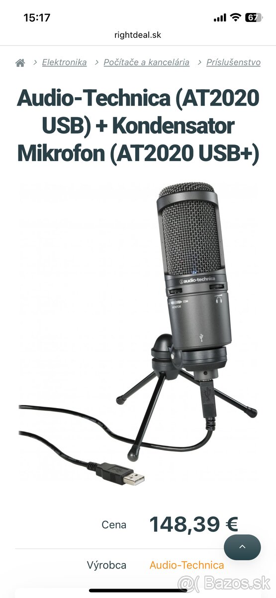 Predám malo používaný mikrofón Audiotechnica AT2020 USB