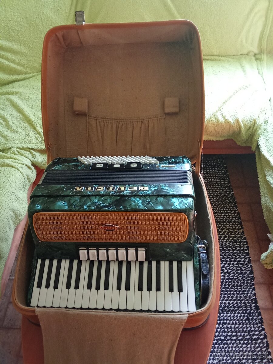 Delicia Melodia V 96 basový akordeón harmonika - [28.12. 2025]Predám akordeón harmoniku Delicia Melodia V 96 basov,Má 7 registrov všetky znejú zreteľne zvučne čisto,a 3 basové,na basovej časti znie 5 hlas,nástroj je v zachovalom stave,všetko ladí,mech nefučí a nieje nikde potrhaný.Ľahká váha nástroja.Cena 250 eur spolu s kufrom. Telefónne čislo 0940 347 666