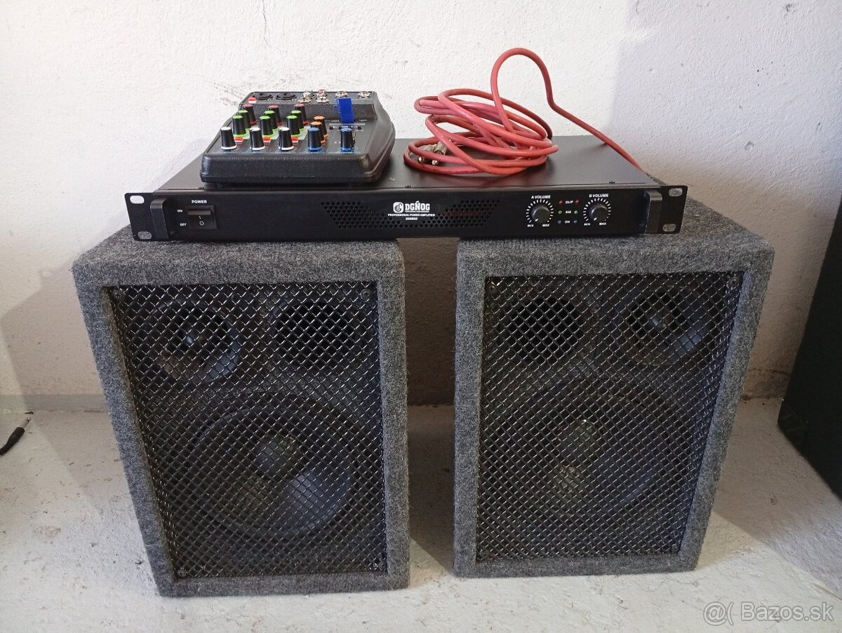 2x dvojpásmové reprobedne (8" bass plus výška), výkon 2x150W/300W, 8ohm. Zánovné, ľahké na prenos, možnosť umiestnenia na stojany.