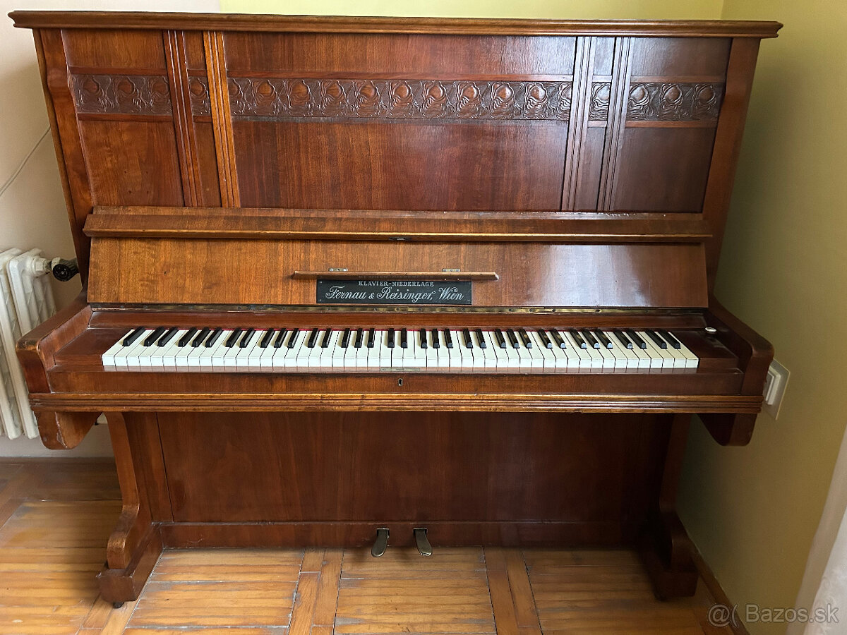 Predám pancierový starožitný klavír s 2 pedálmi z r. 1912, KLAVIER-NIEDERLAGE, Fernau & Reisinger, Wien. Všetky klávesy sú funkčné. Posledné roky slúžil ako nábytok v obývačke nepoužívaný. Je vhodný aj ako darček alebo dekorácia do bytu, baru, kaviarne. Šírka 154 cm, výška 139 cm, hĺbka 65 cm. Otočná stolička je k tomu zadarmo. Dohoda možná. Len za osobný odber.