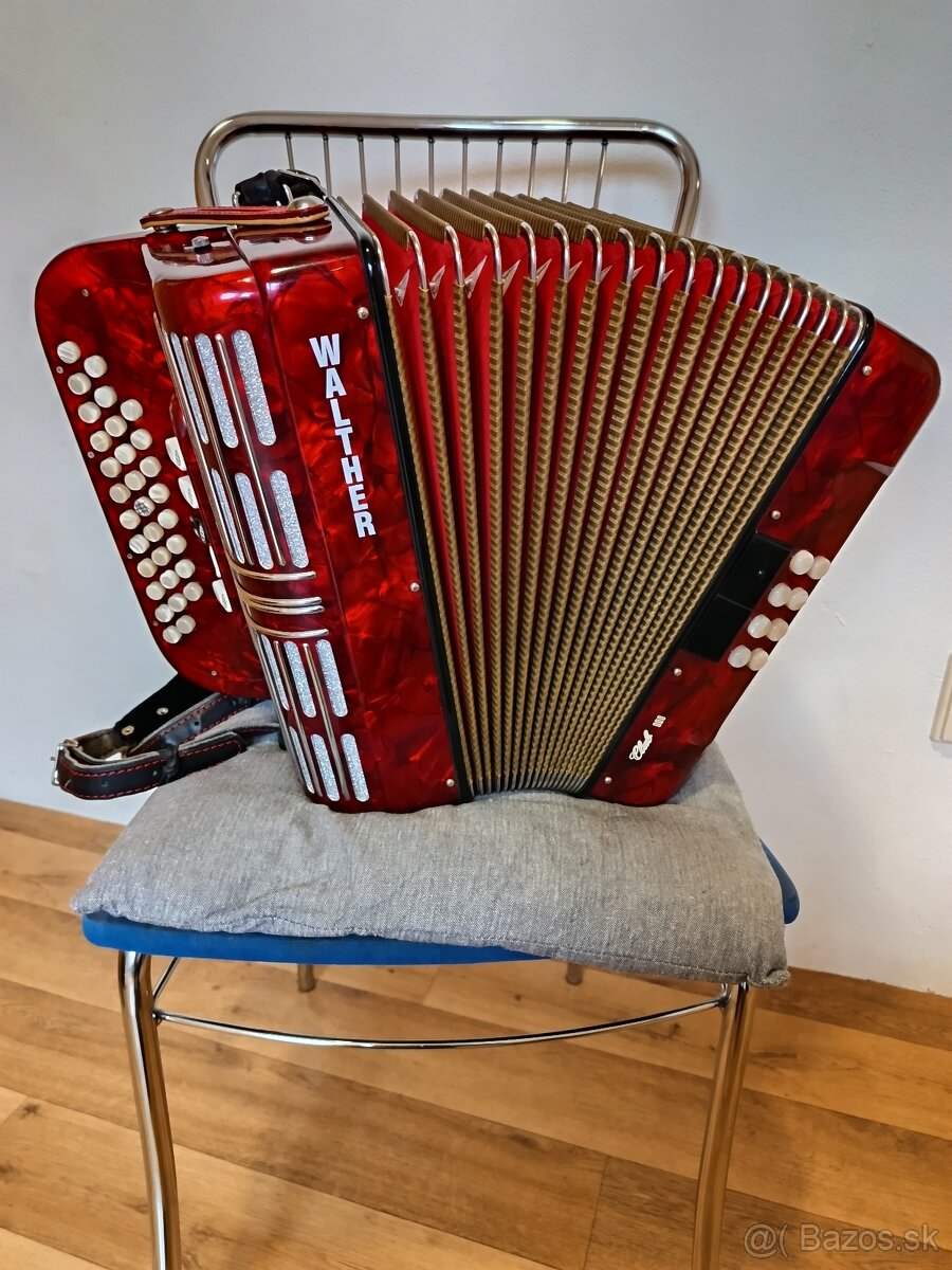 Predam velmi zachovalú talianskú heligonku znacky Walther Club III. Mech je ukazkovy(samozrejme aj zbytok. Heligonka má krásny prenikavý zvuk(talianske hlasy), príjemnú mechaniku, hladucke gombiky, makucku(nic neklepe). Samozrejmostou je stoják, vid. foto je oznaceny. V pravej ruke je to Trojhlas a v lavej stvorhlas. Disponuje sikovnými registrami (mussete, clarinet,...) na basách tiez samozrejme register (moznost polovicnych basov). Je vhodná ako na folklor, tak na ine koncertnejsie piesne, vdaka farbe zvuku, ktorý sa da zvolit s registrami. Heligonka ma dva a pol radu-treti rad je s poltonmi a hlavne obrovska vyhoda je, že je sice ladenia CF, ale ten polrad a bas B je v tomto pripade dovnutra Es, umoznuje hrat uplne v pohode aj v B dure. Tak mas vlastne tri durove toniny na vyber a na basoch zahras B dur stupnicu. Heligonka je samozrejme naladená, v poriadku v povodnom stave bez akýchkolvek poškodení. U mna moznost vyskusat, všetko prekontrolovat. Všetko podla foto.