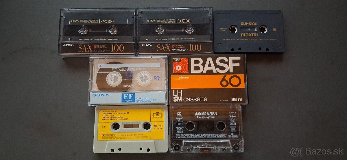 Kazety TDK SA-X 100 2ks/nahrané, MAXELL XLII-S100 bez obalu/nahraná, BASF LH60 nahraná, SONY EF90 čistá, predaj všetkých spolu za 20eur + dobierka 4,50eur.