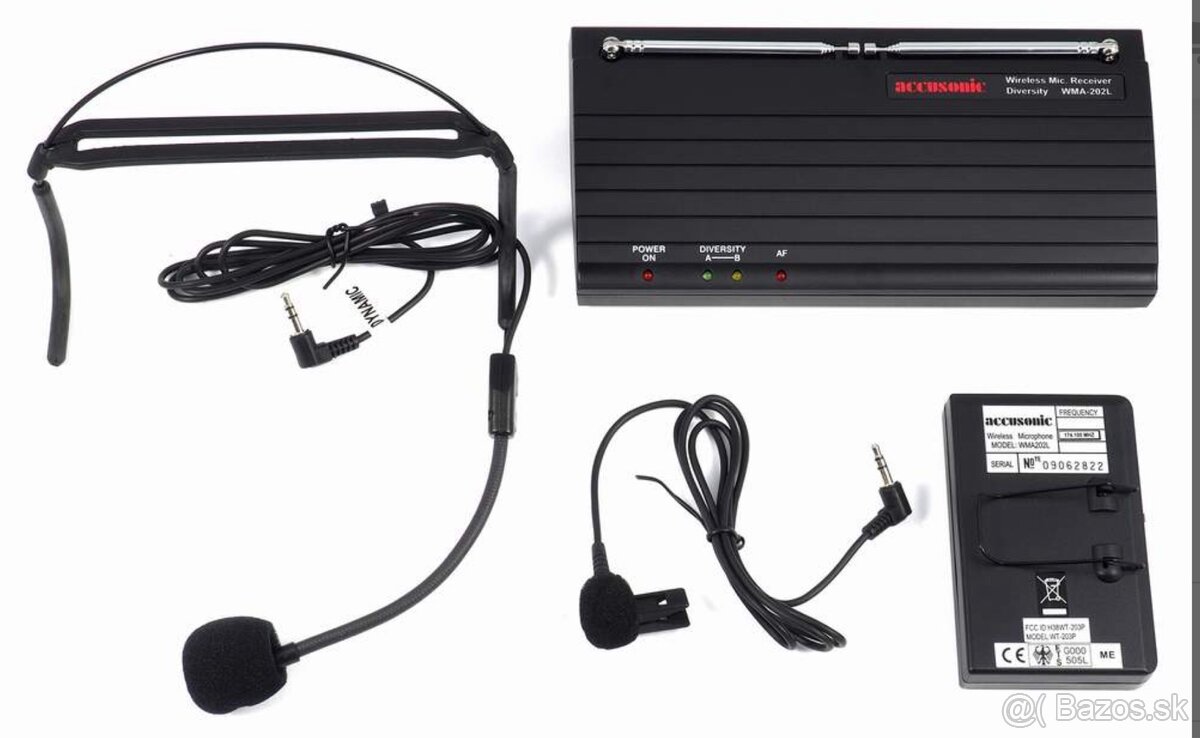 Bezdrôtový diverzitný VHF náhlavný a klopový mikrofón. Prijímač obsahuje dve teleskopické antény a regulátor hlasitosti.