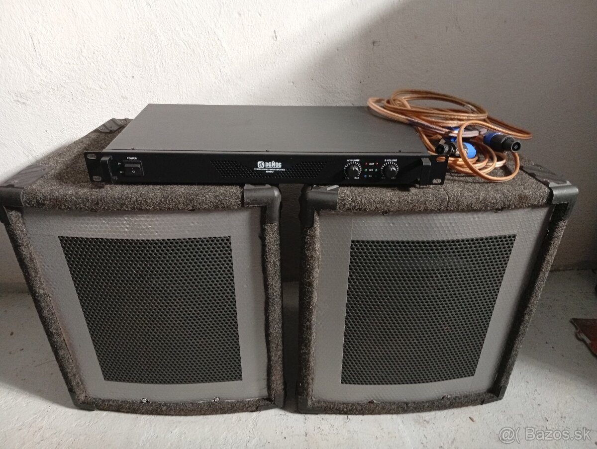 Predám kompletnú zvukovú zostavu. Dvojpásmové reprobedne (10 palcové), výkon 150/300W. Pripojenie speakon. Nový digitálny zosilňovač, 2x200W. Káble speakon -speakon. Cena spolu 200€.
