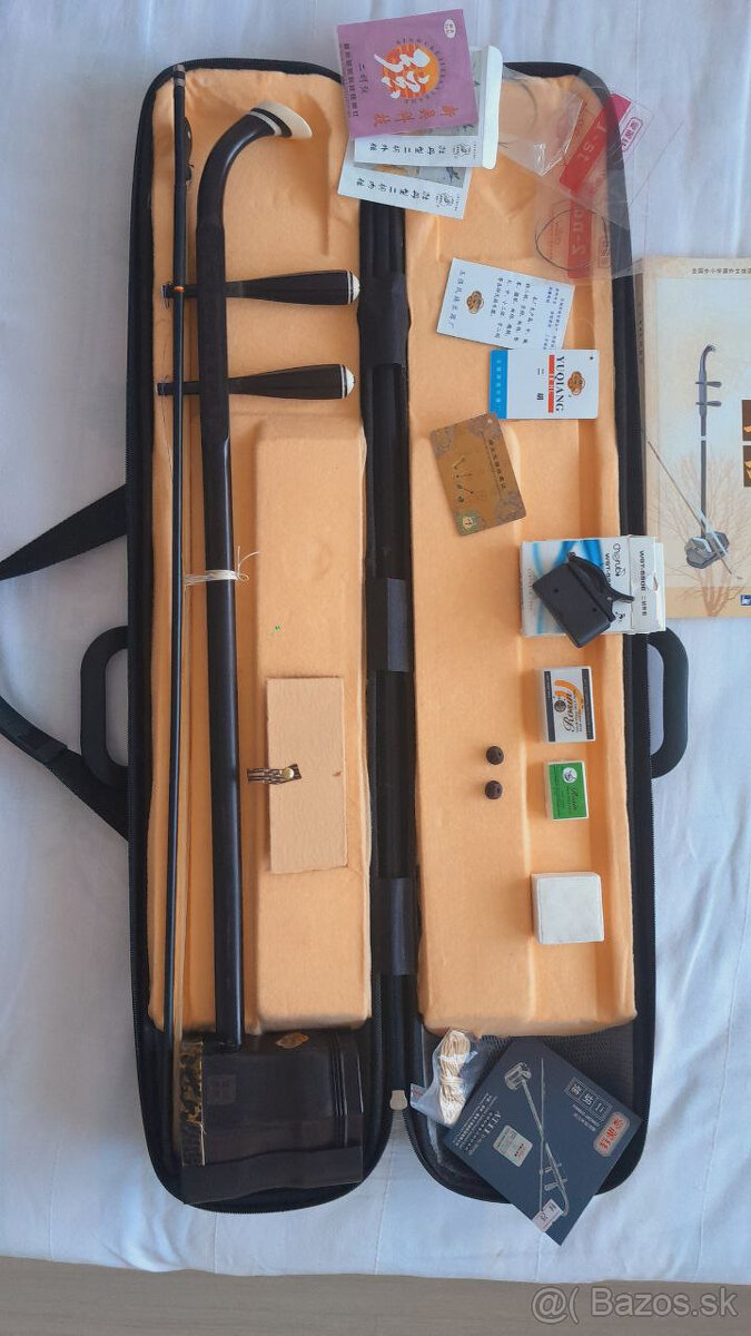Tento tradičný nástroj sa nazýva Erhu a je vyrobený z ebenového dreva od slávneho čínskeho výrobcu nástrojov (provincia Šan-tung). Na oboch stranách vrchu hlavy erhu je vyrytá krásna báseň v čínskych znakoch. Rezonančná skrinka je šesťuholníková a potiahnutá kvalitnou hadiou kožou. Nástroj Erhu, ktorý a zvuk ktorý hrá, je čistý, krásný a príjemný.Súčasťou balenia je aj: elektronická ladička na erhu a učebnica (vhodná pre začiatočníkov), dva kusy vosku a 5 sada náhradné struny.Táto značka je veľmi známa a používa ju mnoho súčasných profesionálných hudobníkov.(možem poslať linky hry profi autorov mailom) (certifikát originality). Keďže ide o hadiu CITES kožu, nemožno ju kúpiť zo zahraničia, pretože colné orgány ju neprepustia. Tento krásny erhu nástroj som dostal ako darček od slávneho hudobníka po tom, čo pred 10 rokmi prišiel na koncert do Bratislavy.Vhodné pre kupujúcich: profesionálnych hudobných interpretov, milovníkov hudby, začiatočníkov, zberateľov hudobných nástrojov atď.