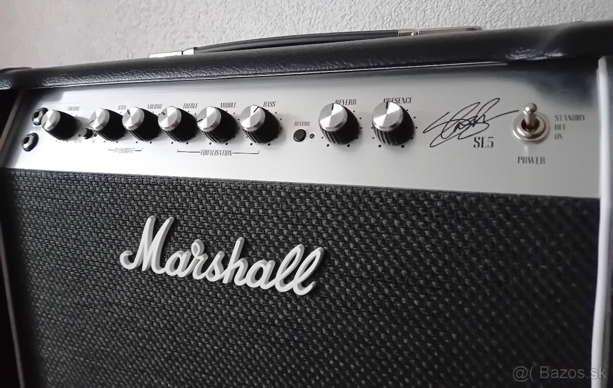 Predám vynikajúce celolampové 2-kanálové kombo MARSHALL SL 5 Slash signature, nepoškodené, ako nové + footswitch + obal. Lampy: 1 x EL-34 a 3 x ECC-83, repro Celestion Vintage 30, možnosť prepnutia na výkon 1W na domáce cvičenie. Dôvod predaja – končím...