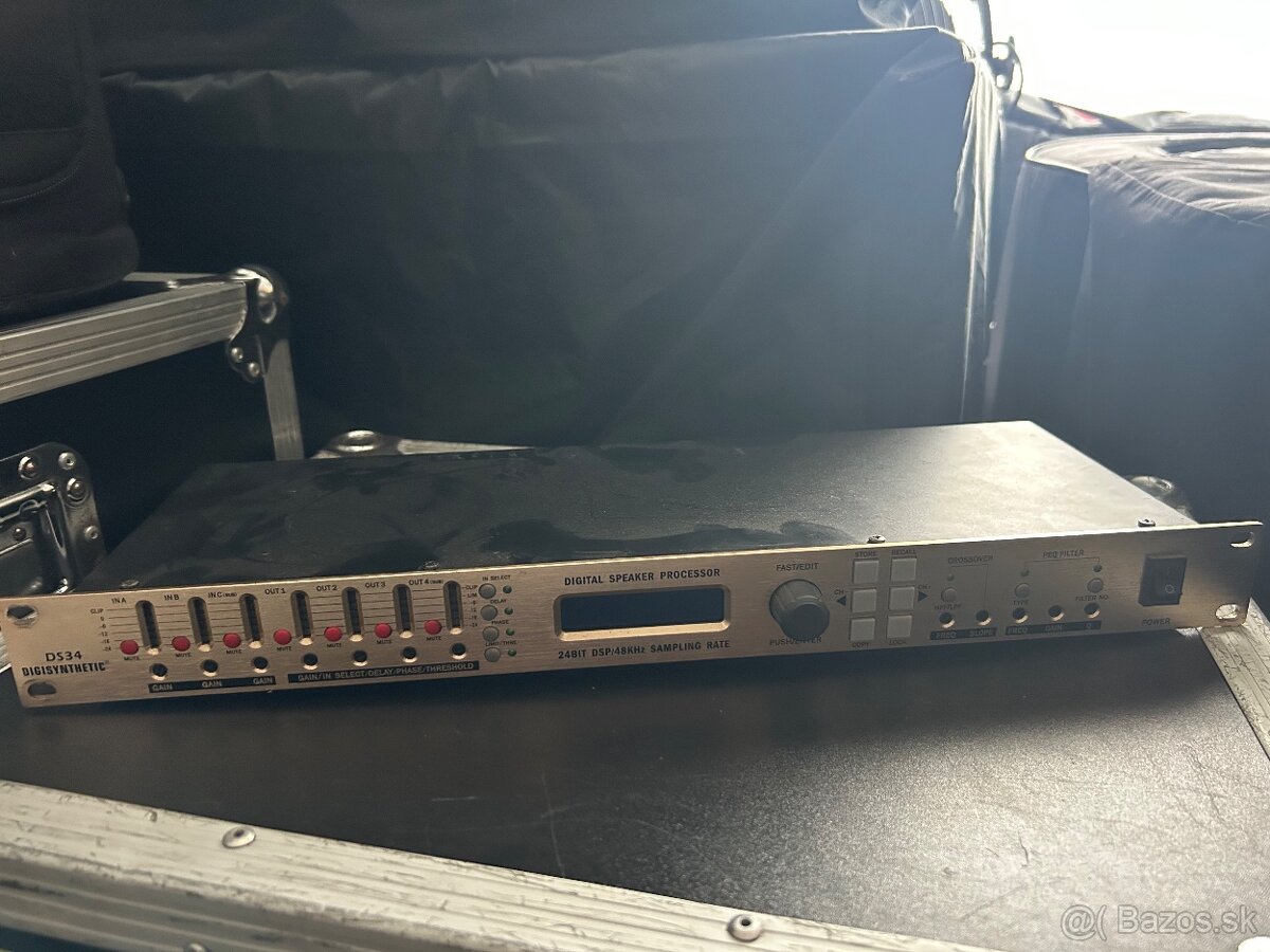 Predám digitálny signálový procesor DigiSyntheticDS34- 3 in 4 out, 24bit. Je v plne funkčnom stave. Obsahuje všetky potrebné nastavenia, delenie od 12 až po 48db/okt, limitéry, delay, na každý kanál je 5 parametrických EQ (bell, hi/lo shelf), možnosť uložiť množstvo presetov.