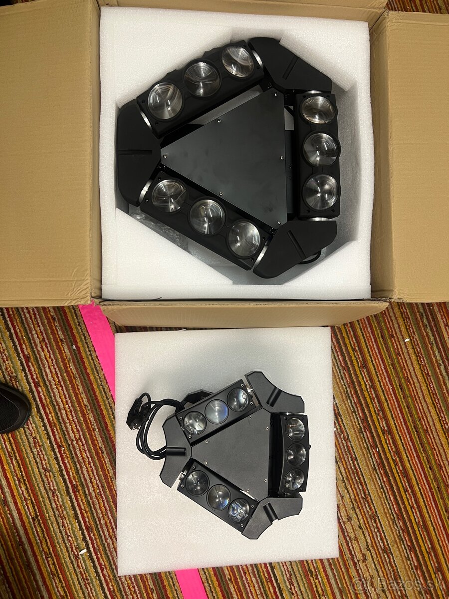 Predám nový centrálny svetelný efekt zo vstavaným WIFI DMX s 9 šosovkami v každej je čip RGBW 15W. Efekt má tri ramená. Robí peknú show. Vie pracovať aj bez ovladača v auto režime.