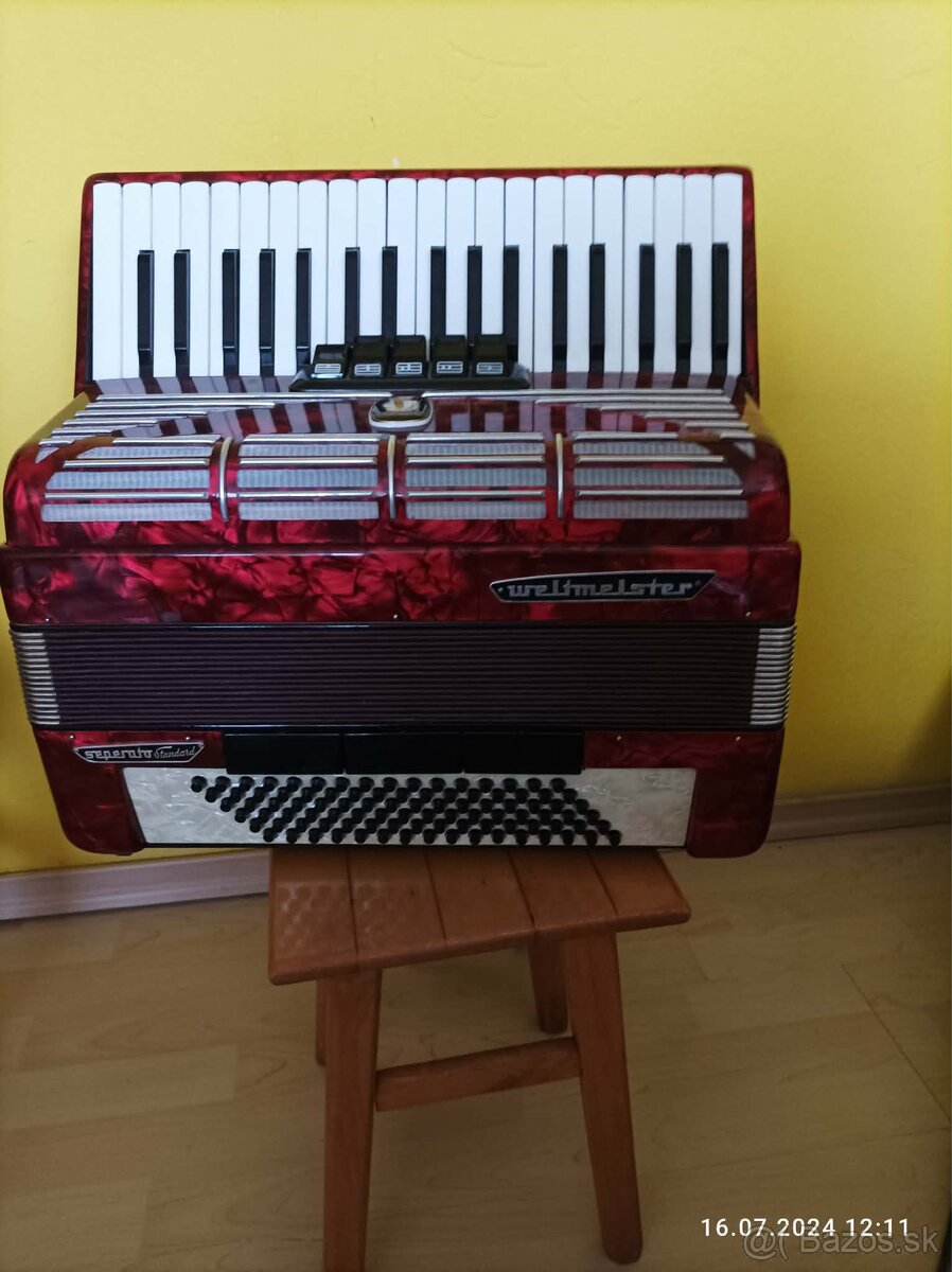 Ponúkam na predaj kvalitný nemecký akordeón Weltmeister Separato Standard v krásnej červenej perleti. Ide o poctivý, spoľahlivý nástroj s 96 basmi, ktorý je vďaka svojej konfigurácii o niečo ľahší a ideálny na dlhšie hranie (svadby, oslavy, folklór).