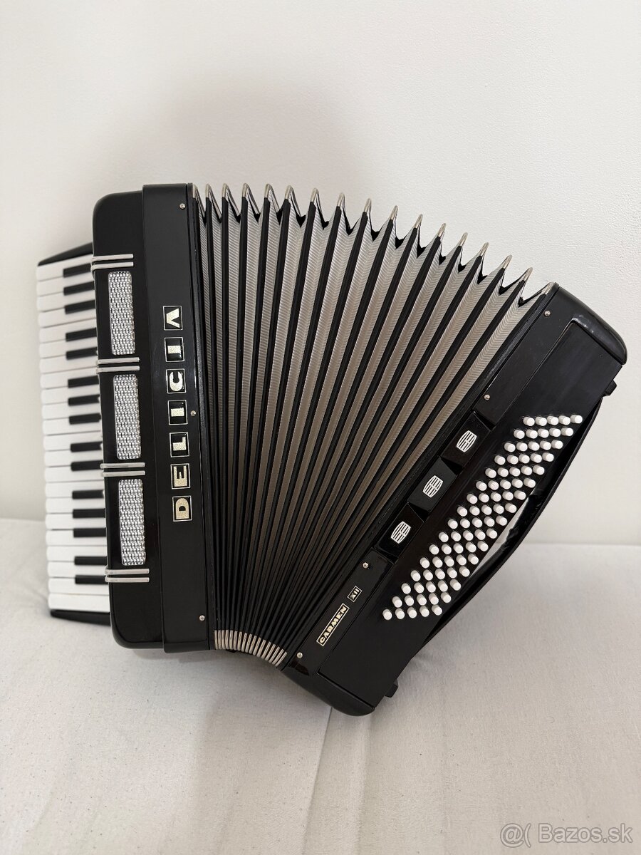 Ponúkam na predaj elegantný akordeón Delicia Carmen XII 80 bas v nadčasovej čiernej farbe.