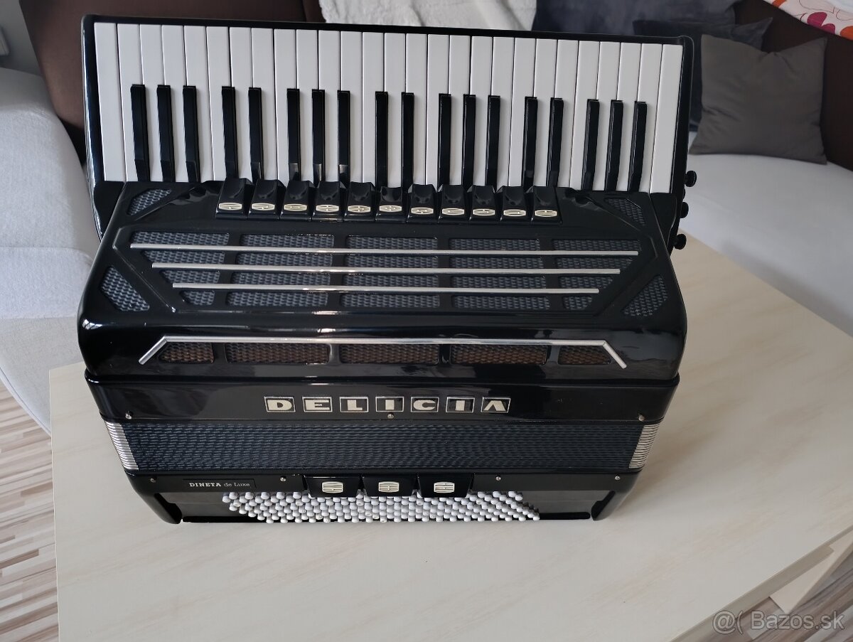 Predám veľmi pekný zachovalý koncertný nástroj Dineta de luxe, talianske hlasy, pravý manuál: 45 kláves, 11 registrov, 3 bradové registre (16,master, 8/4).