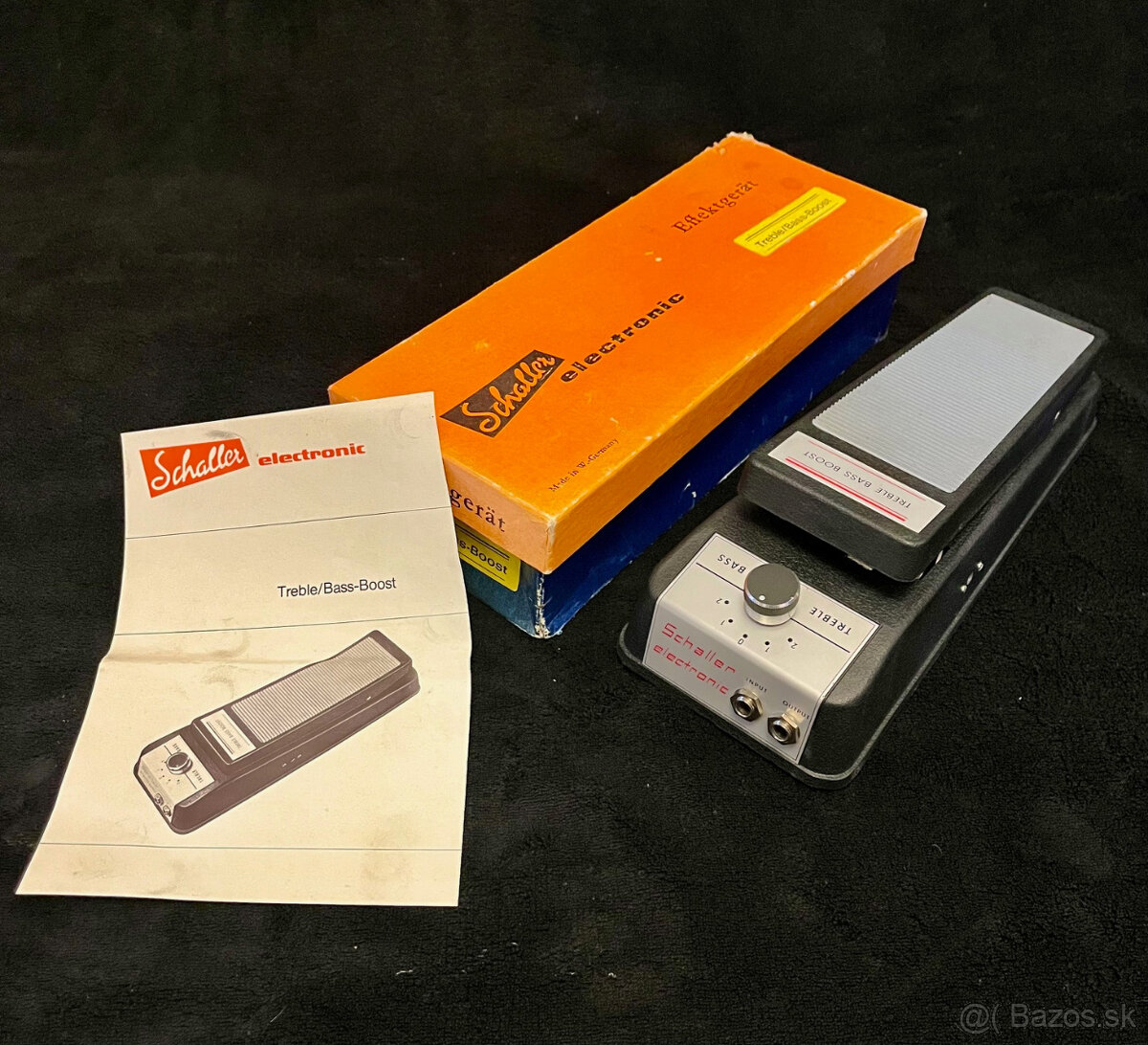 Na predaj gitarový efekt SCHALLER. Výrobca: Schaller Electronic GmbH. Made In GERMANY. Rok produkcie: 1970´s. Druhá výrobná séria. Efekt: TREBLE – BASS Boost / SWELL – Volume. Efekt v TOP 100% funkčnom a originálnom stave v originál balení !!! Nikdy nepoužívaný – uloženka – NOS (New Old Stock). Autentický zvuk 60&70-tych rokov typický pre BEAT-ovú éru Československých kapiel a rovnako zahraničných ako napr. nemeckých The Rattles, Lucifer´s Friend, Embryo, Kraftwerk … Efekt je založený na kópii legendárneho VOX Treble – Bass boost, ktorý pridáva zisk (skreslenie) a ponúka 5 stupňov nastavenia frekvencií od Treble po Bass. Eventuálne sa rovná efektu Rangemaster Treble Booster. Pri práci s Volume potenciometrom gitary sa zvuk krásne dynamicky čistí. Vhodný do štúdia, live použitie ako i pre zberateľa.