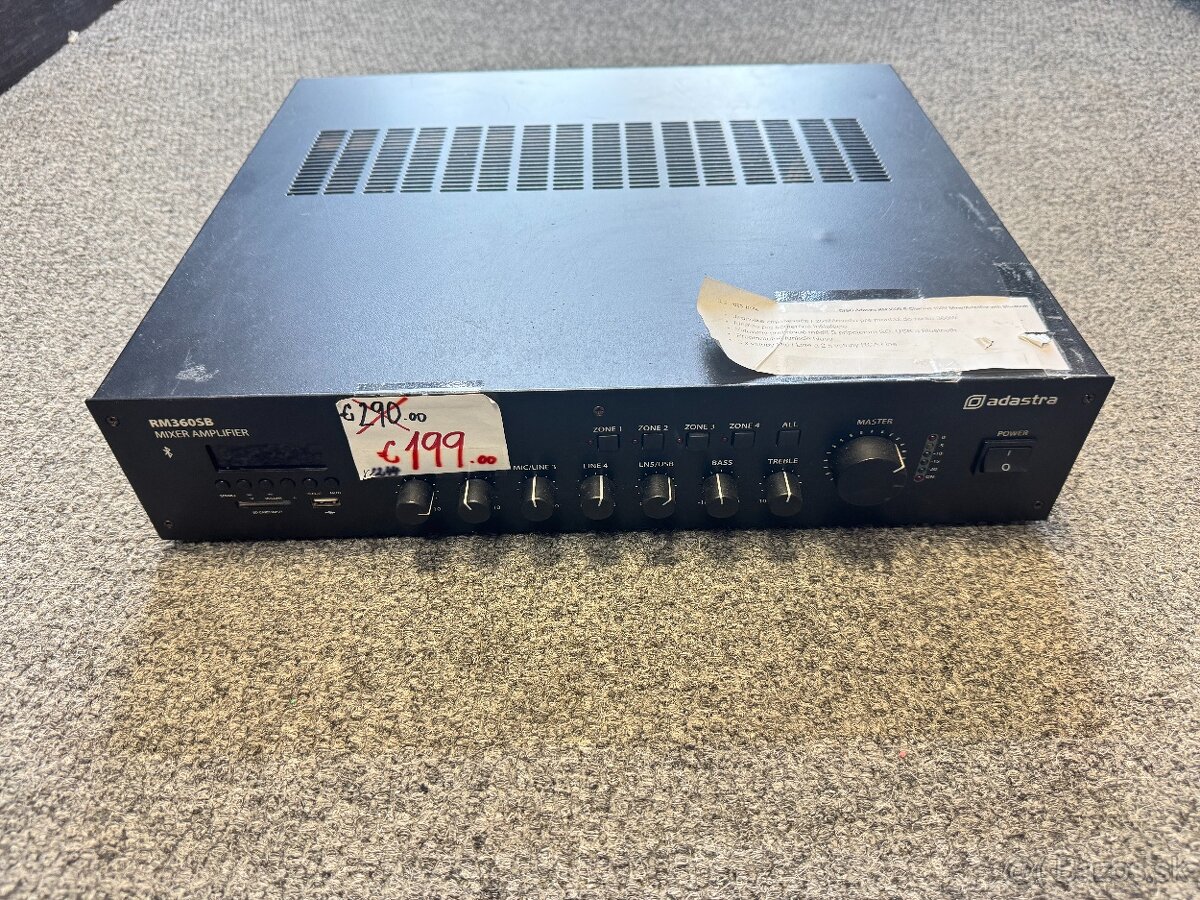 Predám inštalačný zosilňovač Adastra RM360SB, určený na ozvučenie reštaurácií, obchodov, kancelárií, škôl, skladov alebo iných objektov. Vhodný najmä pre 100 V rozhlasové systémy.