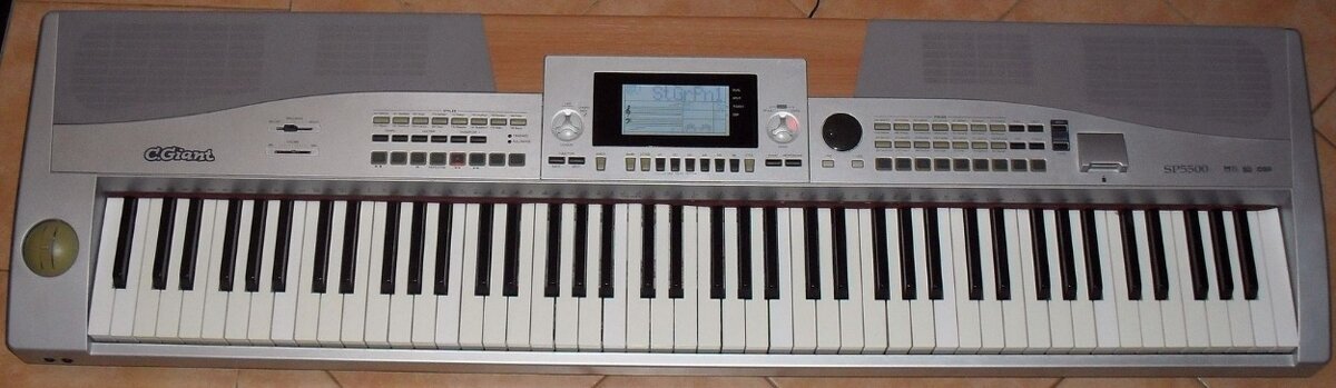 Prodám přenosné digitální piano SP-5500 na díly nebo na opravu - nejde zapnout. Plný klavírní rozsah 88 klapek s kladívkovou mechanikou a nastavitelnou dynamikou, polyfonie 64 hlasů, 559 volitelných zvuků (včetně 9 sad bicích), okamžitý výběr 28 zvuků tlačítky, vrstvení zvuků (dual) a rozdělení klaviatury (split), 203 doprovodných stylů se dvěma variacemi, lze vytvářet a nahrávat nové styly, album 100 interních ukázkových a výukových skladeb, demo skladby, 3 efektové jednotky (reverb, chorus, DSP) s možnostmi nastavení, transpozice, potenciometr brilance, joystick (pitch bend a modulace), mixer, paměť záznamu hry (sekvencer 6 stop pro 3 skladby), výukový režim, chord dictionary a výuka akordů, metronom, OTS, 48 pamětí (panel memory), slot pro paměťové SD karty pro uložení dat a přehrávání midi souborů, velký podsvícený LCD displej. Konektory: 2x sluchátka, Aux in/out, Midi in/out, 2x pedál, USB. Bez příslušenství. Osobní předání.