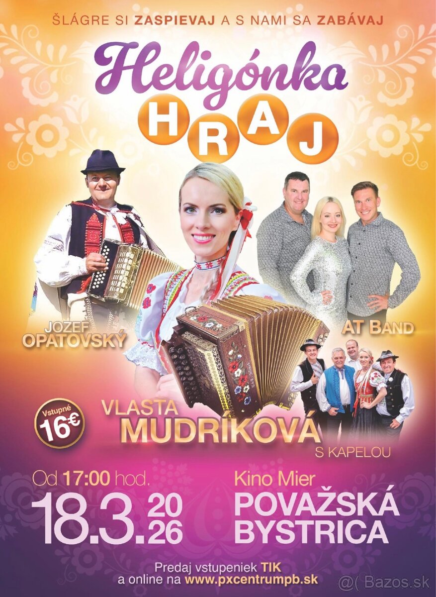 Predám 1 lístok na vystúpenie Vlasty Mudríkovej - heligónka hraj, 18.3.2026 v Považskej Bystrici o 17:00 pôvodná cena 16€ , predám za 10€