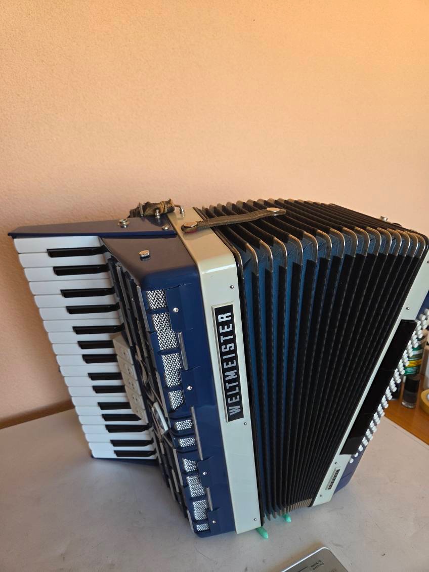 Predám 80-basový akordeón Weltmeister CORDAL modrej farby s modrým mechom vo veľmi dobrom stave. Cena je 600€.