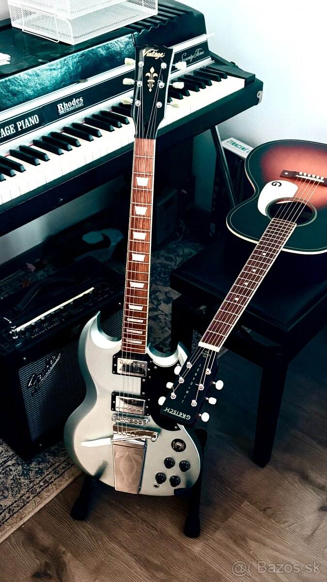 Vintage VS6V Gun Hill Blue je gitara typu "SG", ktorá patrí do série ReIssued. Táto značka je známa tým, že ponúka vynikajúci pomer ceny a kvality, najmä vďaka spolupráci s legendárnym dizajnérom hardvéru Trevom Wilkinsonom.