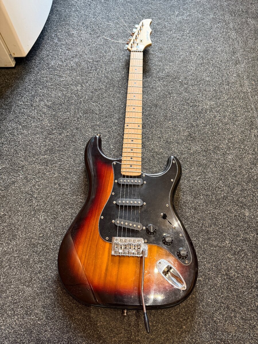 Klasický strat štýl, tremolo páka, 3 single snímače.