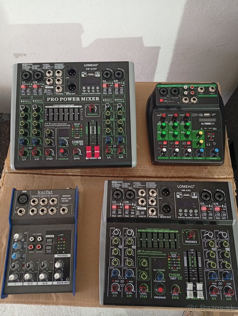 Predám mix pulty. Základný Kaifat 25€. Nový s usb a bluetooth, 2x vstup na mikrofón 40€, väčší 4x vstup na mikrofón, USB, bluetooth, 99 efektov na spev 80€. Mix so vstavaným zosilňovačom ( powermix 2x100W) 120€. Osobný odber s vyskúšanim alebo zaslanie poštou (poštovné vopred na účet kvôli nepreberačom ako napríklad Marek Brezina, Filip Červenak...)