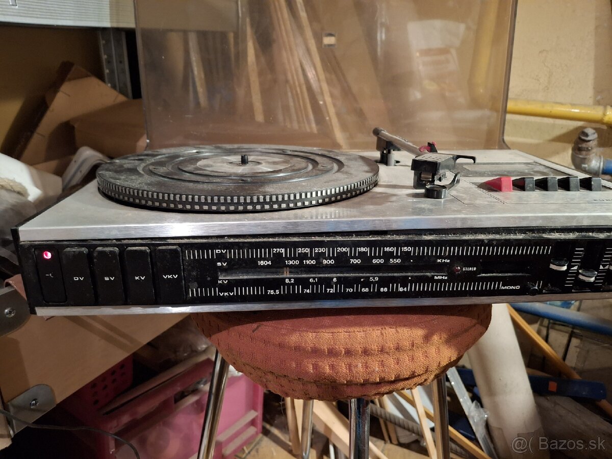 ponúkam na predaj gramofón vyobrazený na fotkách. Je k nemu záruka a veškerá dokumentácia. Gramofón po zapojení do elektriky a stlačení on tlačidla svieti, aj robí nejaký zvuk, kazetový prehrávač sa točí dozadu aj dopredu, len tá otočná vec na platne sa netočí. Nemám záujem to opravovať, nakoľko by som to aj tak nevyužil. Možno niekomu poslúži. Pozri aj moje ďaľšie inzeráty (najmä platne).