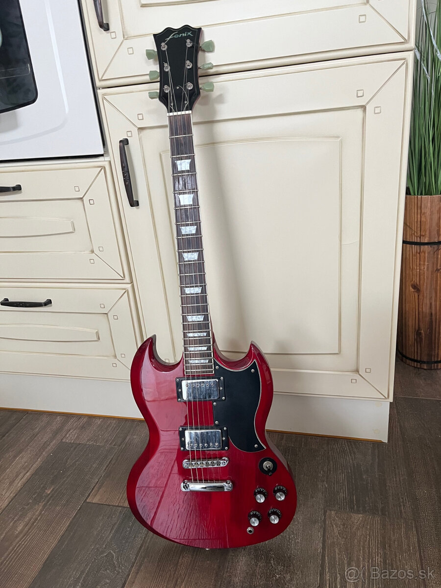 Predám túto cca 30 - ročnú parádnicu z 90- tych rokov, vyrobená v Kórei, firma Fenix robila výborné kópie známych gitár Fender, Gibson atď. z kvalitných driev, na gitare všetko pôvodné, veľmi rezonantný nástroj už nasucho, zvuk ozajstného SGčka za parádnu cenu - 480€