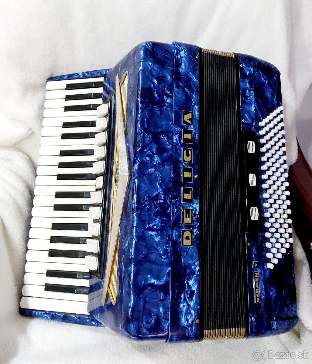 Predám akordeón harmoniku značky Delicia Carmen V model je to 96 basový akordeón,štvorhlasný znie veľmi pekne,má 11 registrov vpravo a 3 registre vľavo basové.Je v dobrom a zachovalom stave,s nástrojom sa hralo iba doma,nezvyčajná modrá farba.Pridám k tomu aj kožený kufor. Cena 350 eur. Telefónne číslo: 0919 369 728
