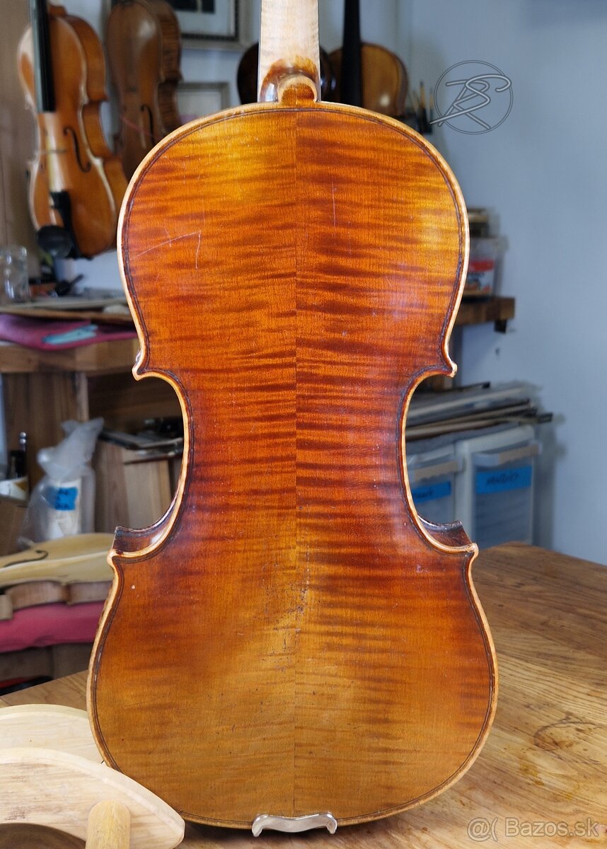Ponúkam do dobrých rúk český značený nástroj Ján Bašta po čiastočnej renovácii. Nový ebenový hmatník, tamarindová garnitúra, kobylka Cremona, struny Thomastik – Infeld red. Husle majú pôvodný lak so známkami užívania. Tón je príjemný, starý, ľahko sa na nástroji tvorí.